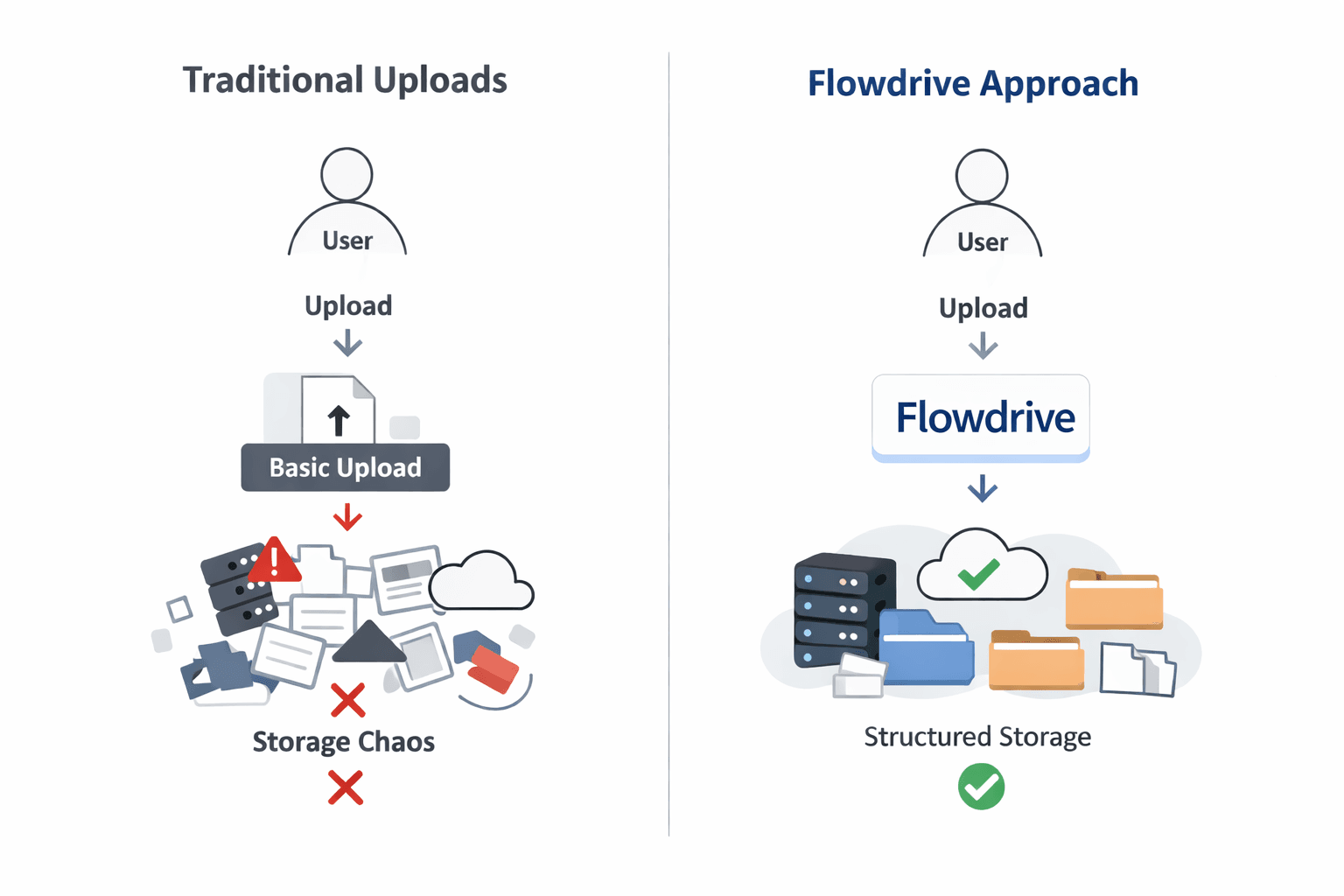 Flowdrive integrates into your frontend and removes the need to build and maintain heavy backend upload logic. The result is a cleaner system that grows with your product.
